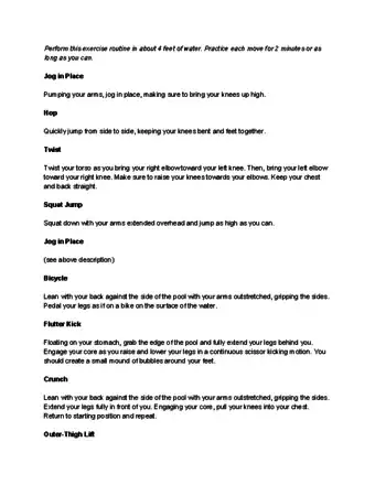6Do knee lifts in the pool. Try a knee lift by positioning your back against the pool wall, and placing both feet flat on the bottom of the pool. Then, lift a knee up as if you are marching in place. When your knee is at hip height, extend it outward.