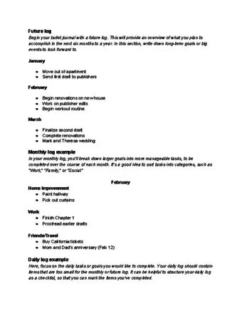 - For example, break down your thesis into small goals and jot them down in your future log. In February, you would write "Complete draft" and in March write "Revise draft."