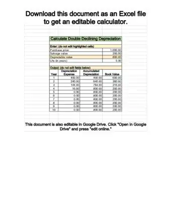 - For the second year, the depreciable cost is now $600 ($1,000 - $400 depreciation from the previous year) and the annual depreciation will be $240 ($600 x 40%).