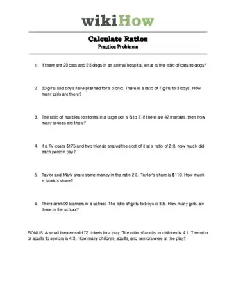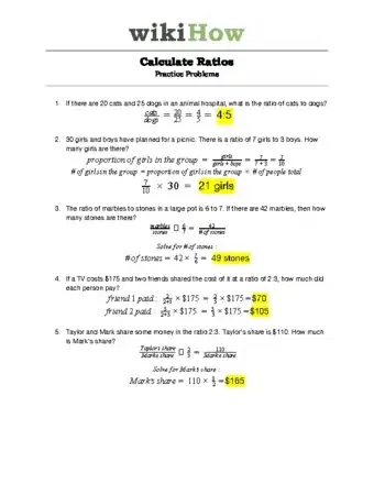 To calculate a ratio, start by determining which 2 quantities are being compared to each other. For example, if you wanted to know the ratio of girls to boys in a class where there are 5 girls and 10 boys, 5 and 10 would be the quantities you're comparing. Then, put a colon or the word "to" between the numbers to express them as a ratio. In this example, you'd write "5 to 10" or "5:10." Finally, simplify the ratio if possible by dividing both numbers by the greatest common factor. To learn how to solve equations and word problems with ratios, scroll down!