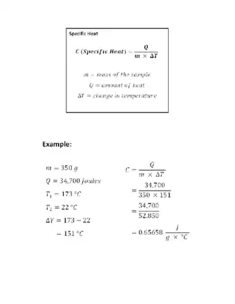 Specific heat is the amount of energy required to raise one gram of a pure substance by one degree Centigrade. The specific heat of a substance is dependent on both its molecular structure and its phase. The discovery of specific heat sparked the studies of thermodynamics, the study of energy conversion involving heat and the work of a system. Specific heat and thermodynamics are used extensively in chemistry, nuclear engineering, and aerodynamics, as well as in everyday life in the radiator and cooling system of a car. If you want to know how to calculate specific heat, just follow these steps.