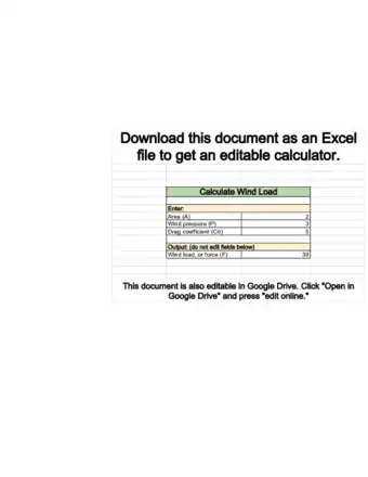 1Define the generic formula. The generic formula for wind load is F = A x P x Cd where F is the force or wind load, A is the projected area of the object, P is the wind pressure, and Cd is the drag coefficient.[2] This equation is useful for estimating the wind load on a specific object, but does not meet building code requirements for planning new construction.