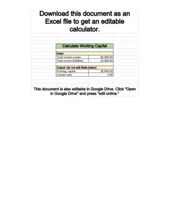 Working capital is the measure of cash and liquid assets available to fund a company's day-to-day operations. Having this information can help you manage your business and make good investment decisions. By calculating working capital, you can determine if, and for how long, a business will be able to meet its current obligations. A company with little or no working capital is probably not one with a bright future. Calculating working capital is also useful for assessing whether a business is making efficient use of its resources.[1] The formula to calculate working capital is: