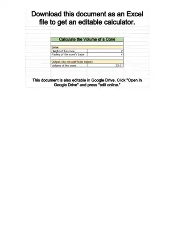 To calculate the volume of a cone, start by finding the cone's radius, which is equal to half of its diameter. Next, plug the radius into the formula A = πr^2, where A is the area and r is the radius. Once you have the area, multiply it by the height of the cone. Finally, divide that number by 3 to find the volume of the cone. Remember to write your answer in cubic units. For helpful sheets you can print out and take with you, read on!