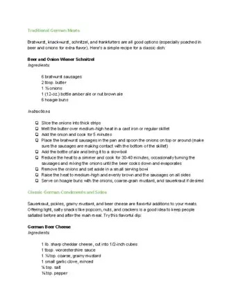 6Prepare traditional German food, like sausages and sauerkraut. Oktoberfest parties aren't complete without some tasty German foods to soak up the beer. Meat is a must, especially sausages, along with some bread and veggies for variety. Set the food out on the table and encourage guests to help themselves![5]