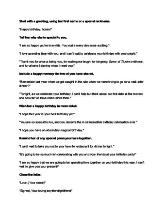 1Plan the menu. The easiest way to decide what to make for your girlfriend’s birthday is to think about her favorite foods and find recipes that you think you can handle. If you’re not an experienced cook, it’s usually best to keep it simple by making a basic pasta dish. To get some inspiration, visit a few cooking websites and skim the recipes until you find the perfect options for your girlfriend.[13]