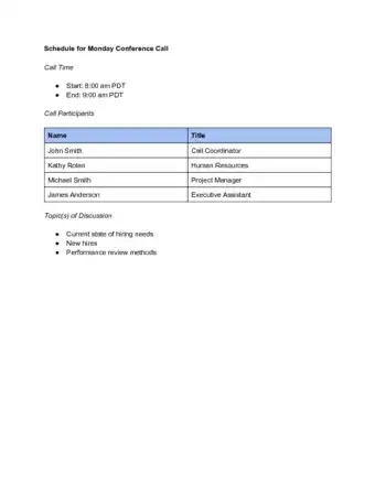 1Allow five extra minutes for latecomers. Have some notes handy to initiate small talk at the beginning of the call. Introduce all attendees by their names, titles, and roles they play. If anyone arrives or joins the call after the five-minute delay, don't interrupt a discussion in progress. Wait until after a speaker has finished or a topic has ended to allow latecomers to introduce themselves.[9]