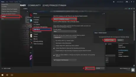 3Close DOTA 2. Go back to Steam > Settings > Interface and this time select the language that you want your game to be in. Click OK and restart Steam, again.