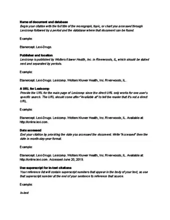 5Add a disclaimer to indicate the database is not freely available. You can only access Lexicomp with a subscription to the service. If using the Vancouver citation style, you must let your readers know that the resource is not available without a subscription.[23]