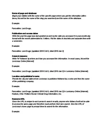 If you're writing a research paper or report in the medical sciences, you may need to reference Lexi-Comp. This online database provides up-to-date information on prescription drugs, as well as modules that cover an extensive range of medical topics.[1] The specific format for your citation will differ depending on the citation style you're using. In the medical sciences, the American Medical Association (AMA), American Psychological Association (APA), National Library of Medicine (NLM) and Vancouver styles are the most common citation formats.