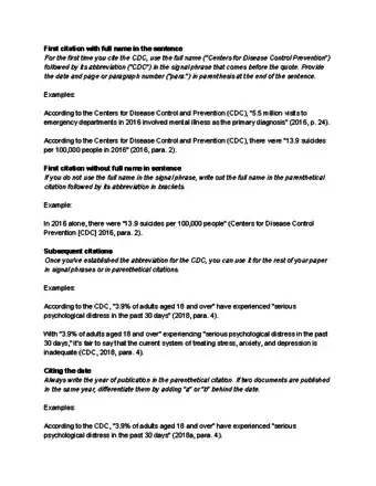 1Include the full name of the CDC and its abbreviation in the sentence introducing the quotation. For the first citation, if you use the full name of the Centers for Disease and Control Prevention in the signal phrase preceding the quotation, you can follow it immediately with the abbreviation in parentheses. Then, for each subsequent citation, you can simply use the abbreviation. In this case, you’ll only include the date and the page number in the in-text citation. In the absence of a page number (in the case of web articles, for instance), you can list the paragraph number (“para.”) followed by the paragraph number. For example:[5]