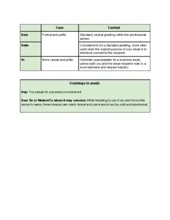 - If you don't know the person's name, avoid overly formal phrases like, "To Whom it May Concern" or "Dear Mister/Miss." Don't go too casual either. "Hi" is far too unprofessional for a business email. You might be better off beginning the email with a simple, "Hello."[2]