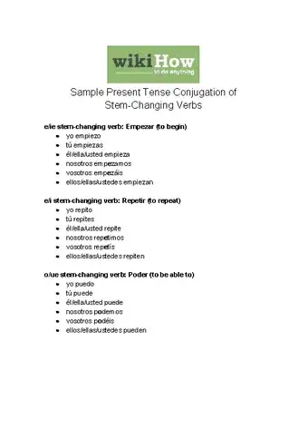 1Conjugate stem-changing verbs. These verbs are also referred to as “radical changing verbs”, which means “stem” or “root” in Spanish. In stem-changing verbs, the stem vowel of the verb changes in the present tense. However, the stem does not change in the nosotros or vosotros forms of the verb. There are a few different ways that the stem vowel can change. Here are some examples: