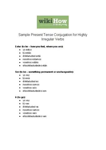 2Conjugate verbs that change in the first person. Some verbs are irregular in their first-person present tense form. The rest of the forms of the verbs will follow the conventions of conjugating regular verbs. It's best to memorize these verbs to conjugate them correctly.[6] Here are a few example of verbs that are only irregular in the first person (the yo form):