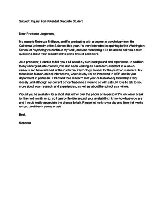 - You can also include the specific research area you want to work in in the subject line. For instance, you could write "Inquiry into Graduate Work on Classical Music Theory."