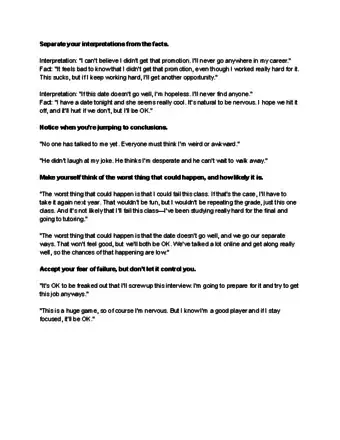 - For example, you might worry about being late to work and think, “If I am late, I will get into trouble.” Ask yourself, “so what?” “I might get a written warning or even get fired.” “So what?” “I might have to look for a new job?” “So what?” “If I can't find a new job, I could end up having to move back in with my parents or borrow money from a friend to get by.” Although this scenario would be unpleasant, you would still be okay if this happened.