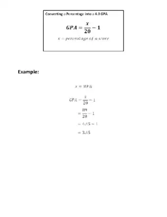 1Know the formula for converting a percentage into a 4.0 GPA. Let's use x to represent the percentage. The formula to use when converting a percentage into a GPA (with a scale of 4.0) is (x/20) - 1 = GPA.