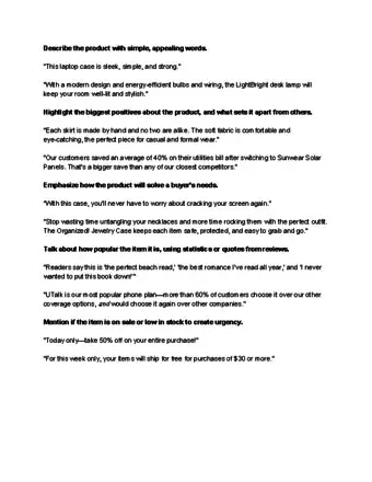 1Write a short paragraph describing the product. Limit the product description to about 4 or 5 sentences. This is enough to give guests an accurate idea of what the product is. Longer descriptions don’t work because the important details get lost in the text and most customers won’t read the whole thing.