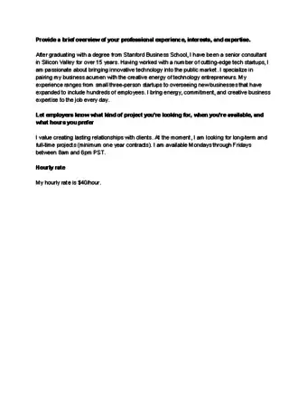 19Write a brief overview of your skills, experience, and interests. Click the text field below the "Write a professional overview" heading, and enter a detailed profile summary here.