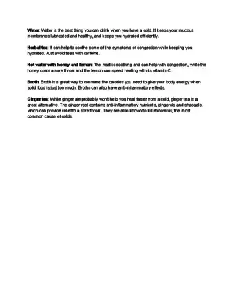 4Drink lots of fluids.[26] All that nose-blowing and sweating it out under heavy blankets can leave you feeling dehydrated, which can worsen cold symptoms, leading to headaches and dry, irritated throats.[27]