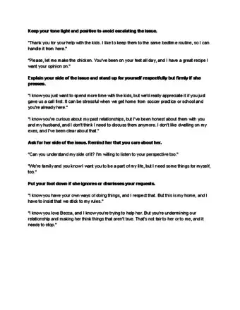 - Say, “We’ve discussed this before, and I’m not comfortable with the way you continue to interfere with my household. I’ve tried to be cordial, and I want to keep the peace, but this has to stop.”