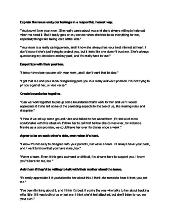 1Explain your feelings to your partner. Respect your spouse’s relationship with their mother, but explain your needs for personal space and autonomy. Make your needs clear, and name specific issues that need to be addressed. Keep your tone positive, and remind your spouse that you don’t blame them for their mother’s actions.[6]