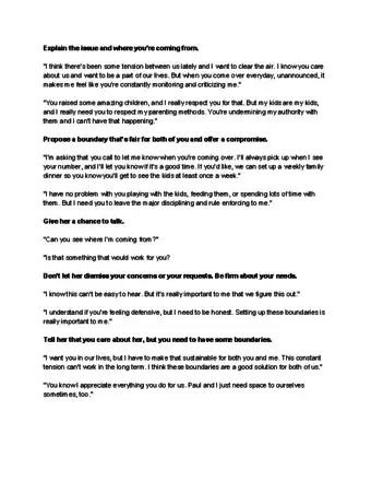 - For example, say, “I understand you’re close with your mother, and I don’t want to get in the way of that. However, I need boundaries. It’s not okay for her to come over unannounced or criticize my parenting skills.”