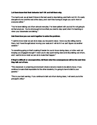 - If the student tries to argue with you anyway, keep your focus on their behavior. For example, the student may say, “I was only asking him if you said we had homework.” You could respond, “I understand, but right now it’s important that everyone listens to me.” If you acknowledge their position and continue the redirection, they should stop talking.