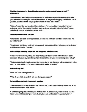 - Try to use “I” statements instead of casting blame. For example, you could say “I feel like you take for granted how often I help you with work projects, even though we don’t work for the same company.”[9]