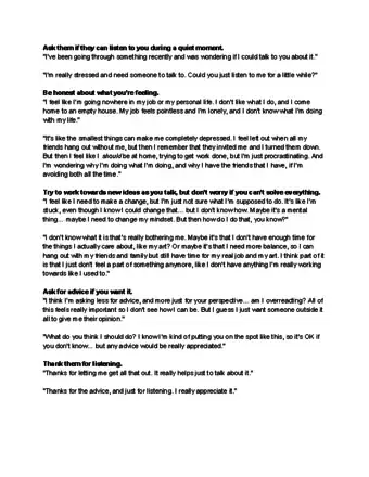 1Talk it out with a friend or family member. Reach out to someone who you trust and who will keep whatever you say confidential. Then, meet with them in a quiet place where you will not be disturbed. Tell them how you are feeling, being as descriptive and detailed as you can. Remind them that you are not looking for advice necessarily, just someone to listen.[8]