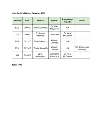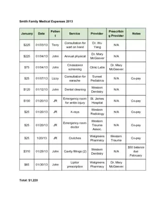 3Keep a spreadsheet of all your medical expenses. Include columns for the date, service, service provider, doctor prescribing the service and notes. Update your medical expenses based on your receipts monthly, or after each expense.