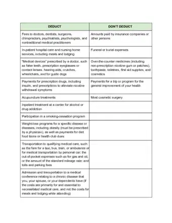 1Review the list of deductible medical expenses on the IRS website. Search for Publication 502. Read the detailed list of deductible and ineligible medical expenses for the current tax year.