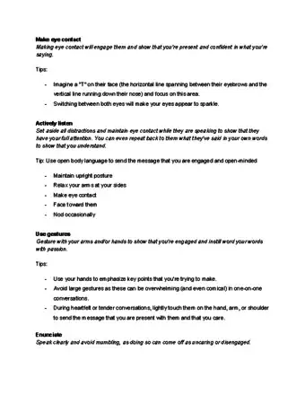 4Be aware of what your body is saying. Body language can say so much more than a mouthful of words. An open stance with arms relaxed at your sides tells anyone around you that you are approachable and open to hearing what they have to say.[4]