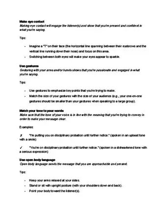 3Don’t send mixed messages. Make your words, gestures, facial expressions and tone match. Disciplining someone while smiling sends a mixed message and is therefore ineffective. If you have to deliver a negative message, make your words, facial expressions, and tone match the message.[3]