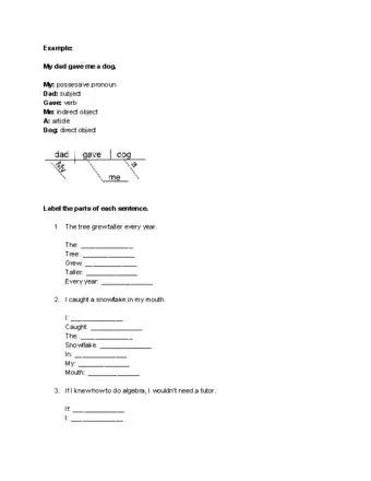 Community AnswerTry it on your own using the instructions above! Hint: "Yesterday" is an adverb modifying the verb "bought"; "Matthew" is the subject; "book" is the object; and "a" is an article. -