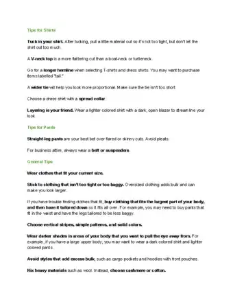 If you’re an overweight man, you can dress well by choosing flattering colors and wearing clothes that suit your shape. It may be tempting to cover up with baggy clothing, but well-fitting shirts and pants will actually make you look more proportionate. When you buy shirts, opt for v-necks rather than crewnecks, because they’ll help elongate your face and neckline. Additionally, choose clothes in darker tones, like navy, dark green, and black, since these colors will make you look slimmer. When it comes to pants, stick to straight-leg medium-rise pants, which will balance out your proportions. For a more formal look, try replacing your belt with suspenders, since they create a great-looking silhouette. To learn how to choose the right tie for your outfit, read on!