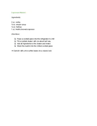 6Shake up a coffee martini. To make a drink with a bit of a buzz to it, fill a shaker with ice. Pour in 2 oz. (4 tbsp.) of vodka, 1 oz. (2 tbsp.) of Kahlua, and 1 oz. of chocolate liqueur. Shake them together vigorously and pour the drink into a martini glass. If you wish, top the martini with espresso beans or chocolate flakes.[6]Advertisement