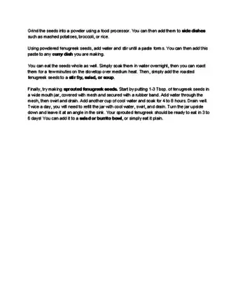 To eat fenugreek seeds, place them in a bowl with 1 cup of water. Then, cover the bowl and let them soak overnight so they can absorb some of the water. In the morning, pour the seeds through a strainer to get rid of the excess water. If you’re eating the seeds to help you lose weight, eat a cup on an empty stomach when you wake up. Alternatively, grind the seeds using a seed grinder or food processor. Once the seeds have reduced to a fine powder, sprinkle them on top of your favorite meal. You can also add water to the powder to make a paste, which you can mix into a curry. For more tips, including how to roast fenugreek sides to add to a dish, read on!