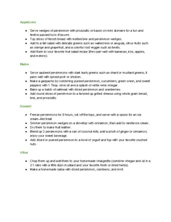 1Add sweet persimmons to salad. Firm, crisp sweet persimmon works wonderfully in both fruit salads and green salads. Add it to autumn salads that include nuts, cheese, or pomegranate, or try this unique recipe:[12]
