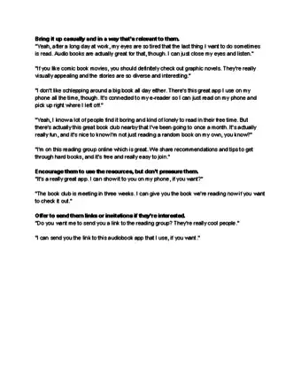- Bring examples of various fiction and nonfiction books of various genres (business, self-help, romance, true crime, humor) to illustrate that there are books out there for whatever your interests are.