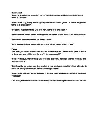 1Use family-friendly language in your ending. Weddings typically include guests of all ages. Even if kids aren’t in attendance for your speech, the couple’s parents and grandparents probably are. Leave explicit language and dirty jokes at home.[1]