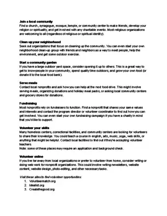 4Volunteer to write for organizations online. If you live in a rural or remote location, or if you would rather engage with others online rather than in person, you can volunteer online. For example, volunteer to perform web work for nonprofit organizations or write newsletters for charities. Online volunteering can give you a sense of accomplishment and foster personal connections.