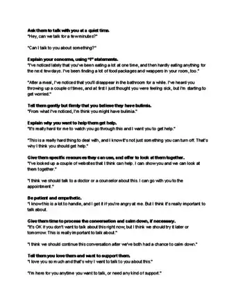 - Say, "Lately I've been noticing that you throw up after we eat dinner. I don't know if you realize this, but that's a symptom of bulimia. Here is some information I printed out for you."