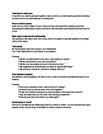 - Don't be too quick to jump back into the relationship. Sometimes, you idealize the things you no longer have. Don't forget why you broke up. If you're only going to jump back into the same problems, then steer clear of your ex.Thanks!