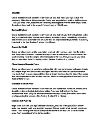 - Begin by lying flat on your back on an exercise bench and hold the weights with both hands. Keeping your back flat, push the weights away from your shoulders and into the air. Inhale as you bring the weights back down to your chest, and repeat the process 10 more times.[21]