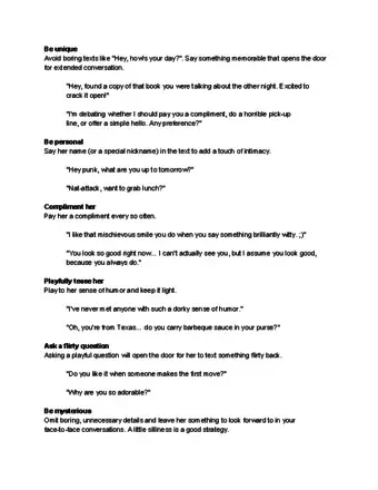 6Be suggestive. Of course, no text flirting relationship would be complete without a little naughty suggestiveness to keep things interesting.