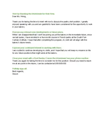 6Close with a final thank you and your contact information. Thank your interviewer one final time for keeping you posted during the interview process. Make sure they have your name and phone number. Then, close out the letter with “Sincerely,” followed by your full name.[20]