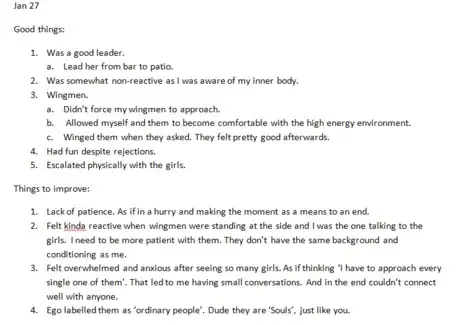 6Keep a journal. After practicing pickup, jot down the good things and things you need to improve in a journal. You cannot always record yourself, so keeping a journal can be quite yielding to become more aware of the mistakes and good things you have been doing, during your interactions. You can also make voice recordings of your mental notes. Read the notes in the image to get a better idea.