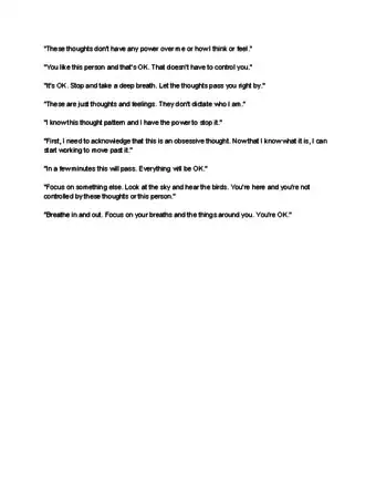 - Tell yourself, “These are obsessive thoughts,” or “I’m acting obsessively.” Say, “These thoughts don’t control me; I control them.”