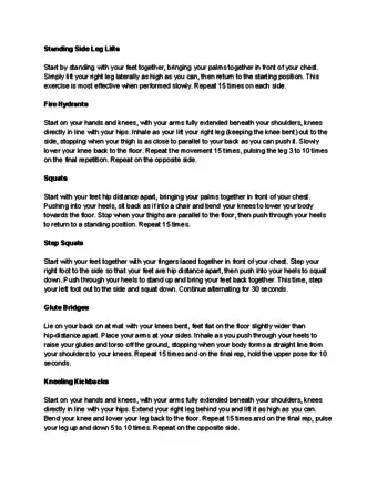 - Do 10 to 15 reps with each leg for 2 to 3 sets.